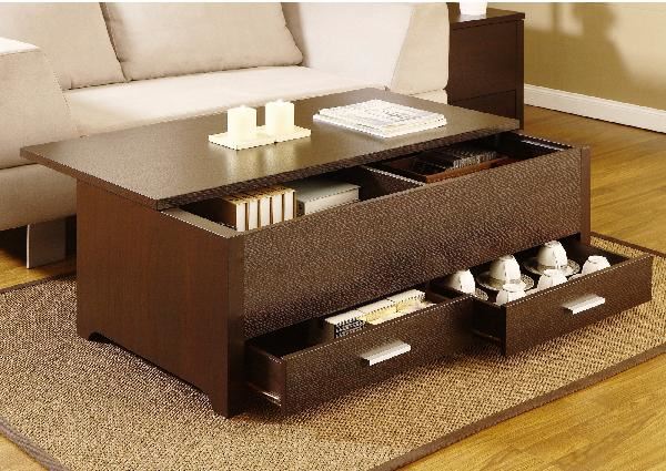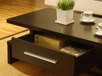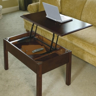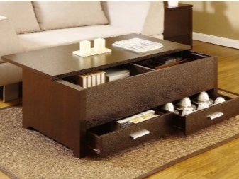Zum Beispiel werden sie sehr oft für Wohnzimmer verwendet. Es kann entweder ein kleiner Couchtisch mit einem einziehbaren Design für die Arbeit mit einem Computer oder Papier sein, oder echte Tische-Schränke mit vielen Schubladen und Fächern für die Aufbewahrung verschiedener Gegenstände.
