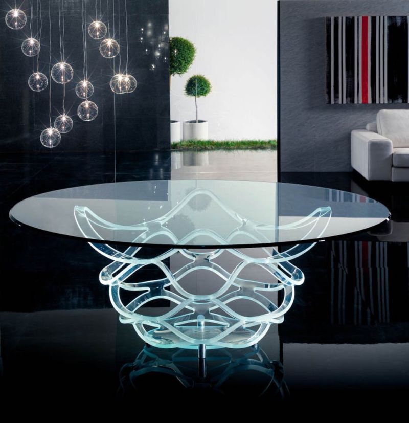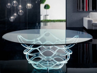 - Es ist interessant und ungewöhnlich, Glasmodelle von Tischen mit dekorativen Elementen aus Schmiedeeisen oder Stein anzusehen.