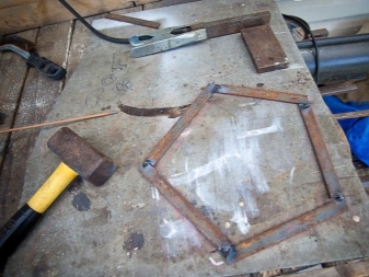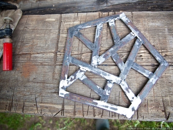 Schablonen werden in Übereinstimmung mit der vorgesehenen Größe hergestellt. Lamellen werden abgeschnitten - das sind alles Rohlinge für die Sitze. Die Streifen werden geschweißt, dadurch erscheint die gewünschte Form. Die Lamellen sind in noch kleinere Streifen geschnitten, sie sollten innen passen.
