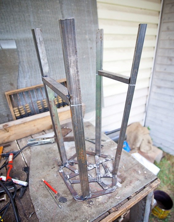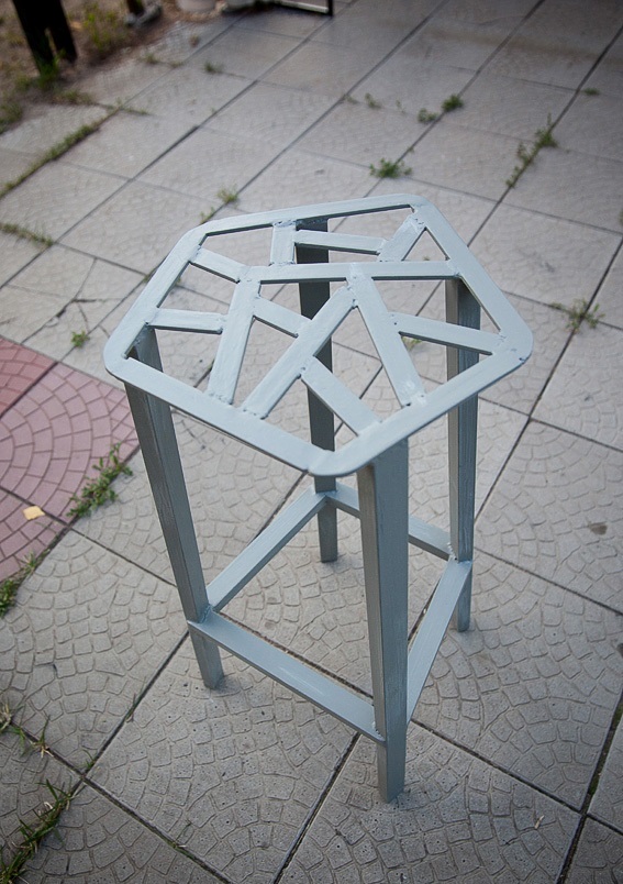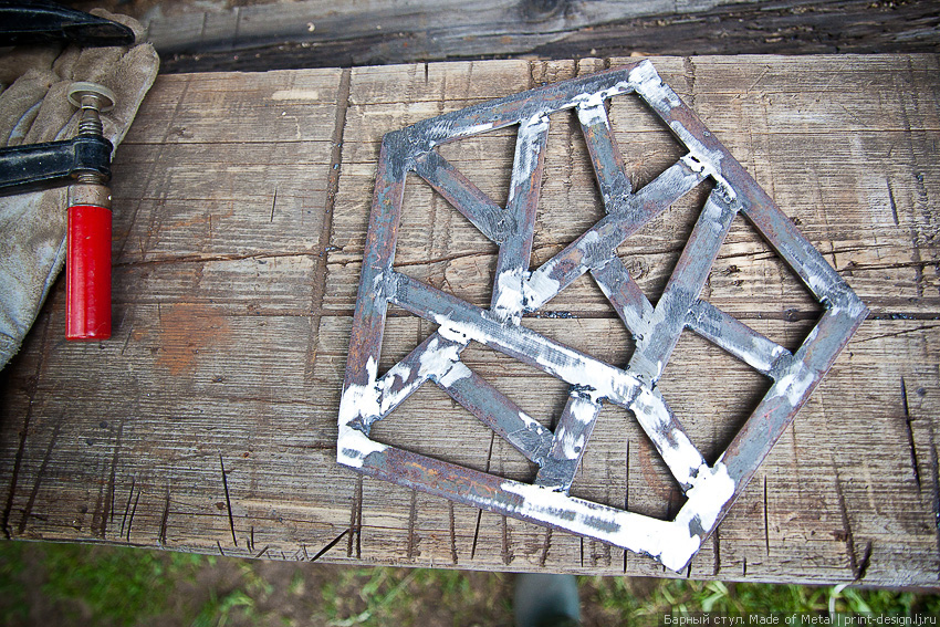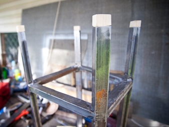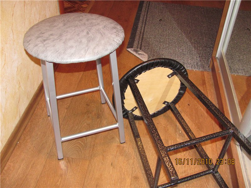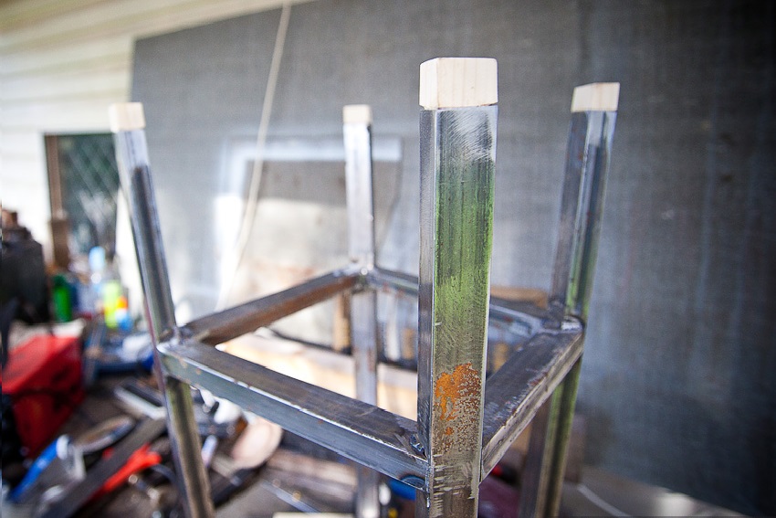 Metall - hartes Material, sicher sein, dass die Enden der Beine mit Gummi- oder Holzdüsen isoliert sind. Nachdem das Produkt hergestellt ist, beginnt die Fertigstellungsphase: Das fertige Ding wird grundiert und lackiert.