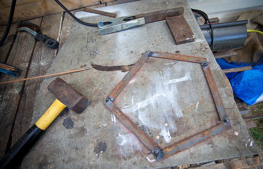 Sperrholz ist eine Schablone, die als Leitfaden dient. Dünne Streifen werden geschweißt, so dass die Form erscheint.