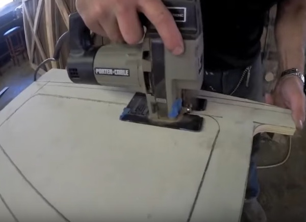 Ein Kreis mit einem Durchmesser von 370 mm wird ausgeschnitten - dies wird der zukünftige Sitz sein. Wenn es im Haus keine speziellen Holzbearbeitungsgeräte gibt, wird das Profil entlang der Kontur umrissen, ausgeschnitten, die Oberfläche wird mit einer Schleifmaschine bearbeitet.