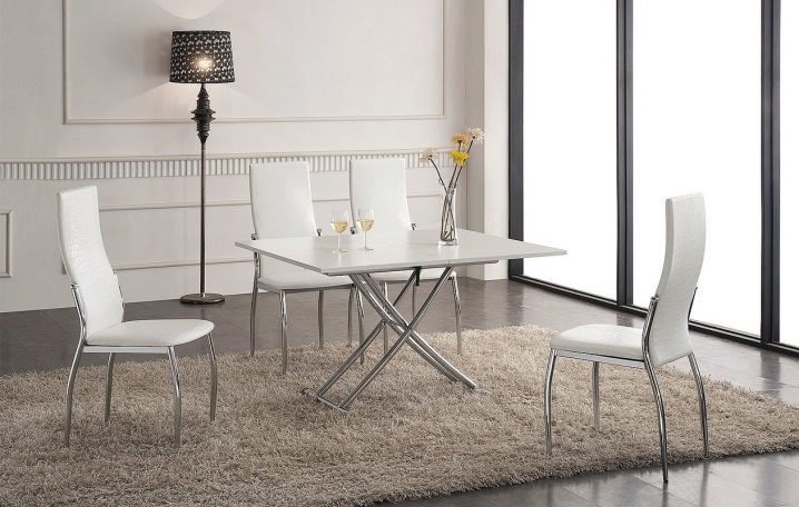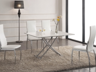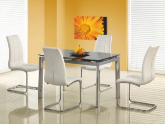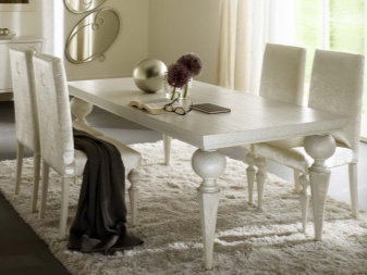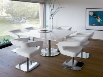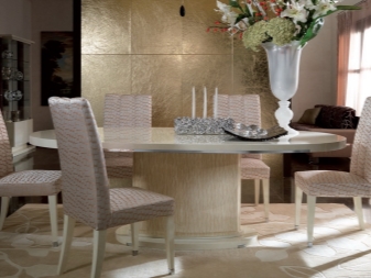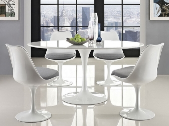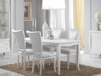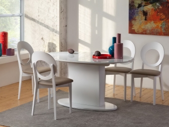 - Die optimalsten und modernsten Farblösungen sind Produkte in weißer Farbe und in anderen Schattierungen - milchig, hellgrau, blassrosa. Helle Polsterfarben können nur gewählt werden, wenn Sie sich auf die Stühle konzentrieren möchten.