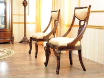 - Der geschnitzte Rücken und die Beine der Stühle sowie starre Armlehnen sind charakteristisch für den modernen Stil des Empire-Stils.