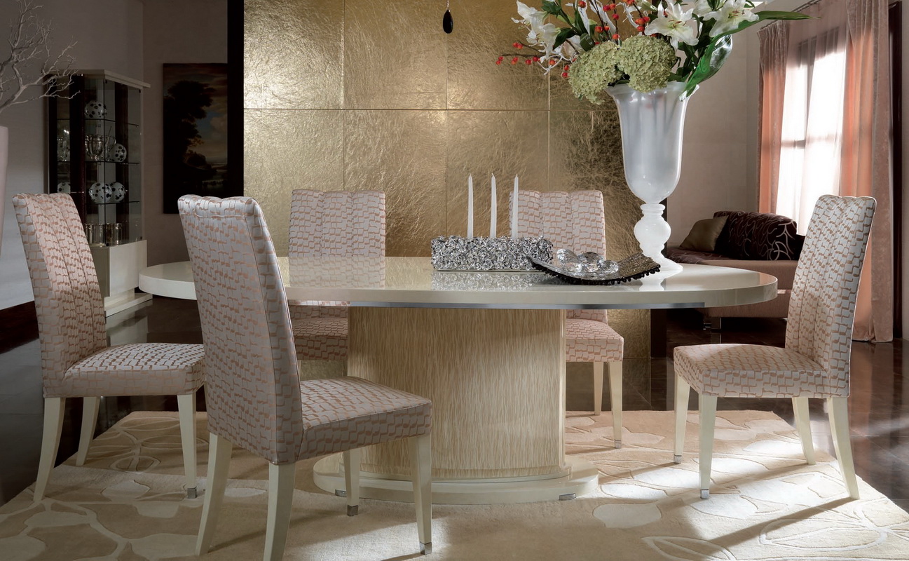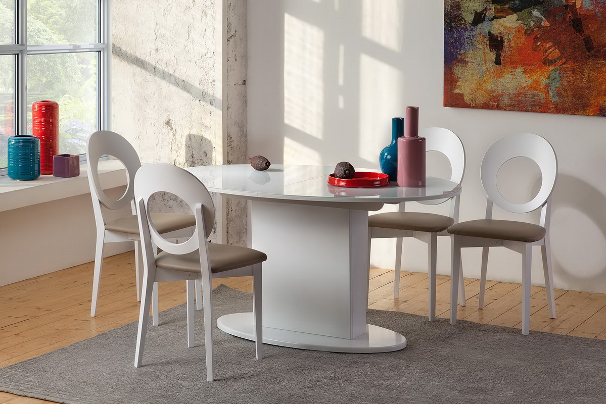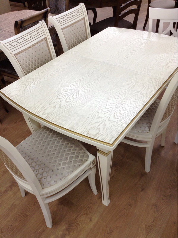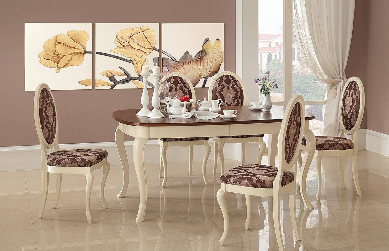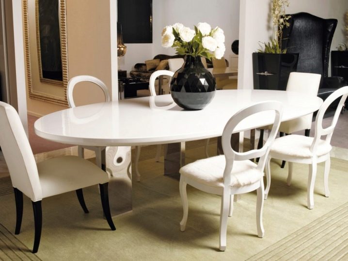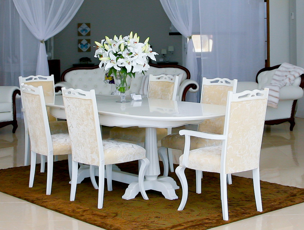 Klassische Option für Wohnzimmer oder Esszimmer. Das prachtvolle Ensemble aus einem schneeweißen ovalen Tisch und eleganten Stühlen in der Farbe der gebackenen Milch ergänzt das Interieur in hellen, hellen Farben.