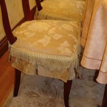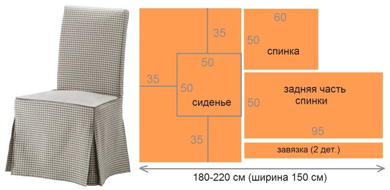 Die kleinsten sind die Abdeckungen, die nur Sitzbezüge sind. Wenn Sie die Abdeckungen selbst erstellen, müssen Sie genaue Messungen durchführen und alle Parameter um ungefähr fünf Zentimeter vergrößern. Ein Standardstuhl benötigt ungefähr 1,5 Meter Stoff.