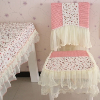 Solche Produkte haben in der Regel ein klassisches Design, insbesondere für Wohnzimmermodelle. Aber die Capes auf den Stühlen für die Küche haben oft ein ungewöhnliches Design. Sie sind mit Tierdruck, Bildern von Blumen, Blättern und sogar Obst und Gemüse dekoriert. Sie werden für das Farbdesign der Küchenschürze oder zum Zeichnen auf der Tischdecke ausgewählt.