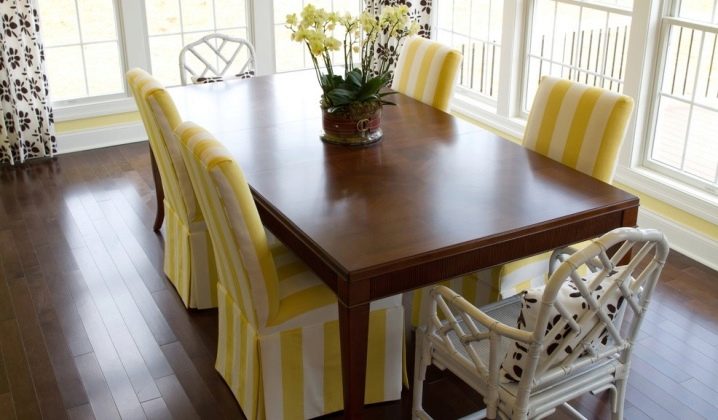 Für die Herstellung von Bezügen für solche Möbel wird oft ein sehr dichtes und robustes Gewebe verwendet. Insbesondere betrifft es die Modelle für Küchenstühle. Sie sollten keinen Schmutz passieren und viele von ihnen sind aus wasserdichten Materialien hergestellt. Dazu werden häufig vielseitig verwendbare Materialien verwendet, die oft gewaschen und fleckenbeständig sein können.