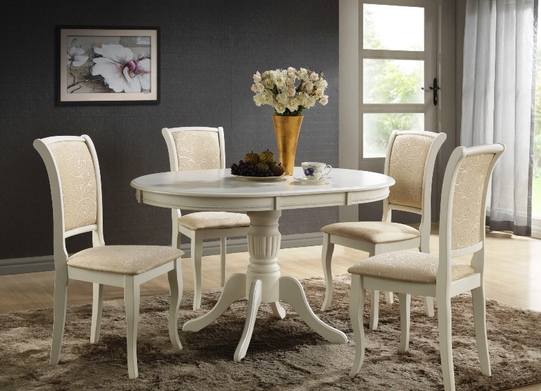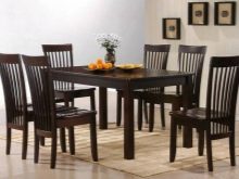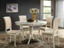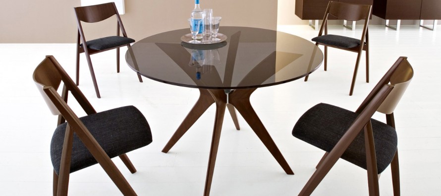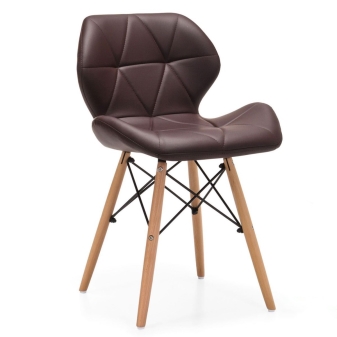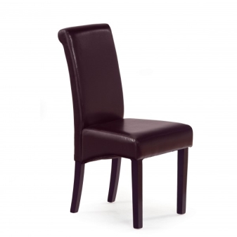 Lackierte Schoko-Stühle mit leichter Polsterung können in einen geräumigen Raum gestellt und um einen runden, braunen, polierten Tisch gelegt werden. Die Wände und der Boden in solch einem Raum sollten in hellen Farben dekoriert sein.