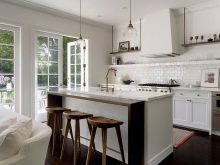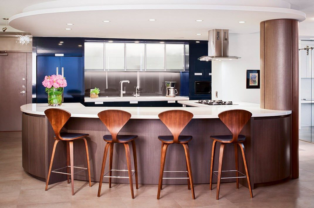 Ungewöhnliche runde und niedrige Hocker aus Holz werden in der Nähe der langen hölzernen Arbeitsplatten auf einem schwarzen Metallrahmen stilvoll aussehen.Sie können das Interieur mit Hilfe einer schwarz-weißen Wanddekoration und eines dunklen Schokoladenbodens, ergänzt durch einen hellen Teppich, originell gestalten.