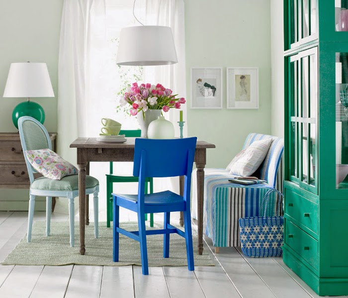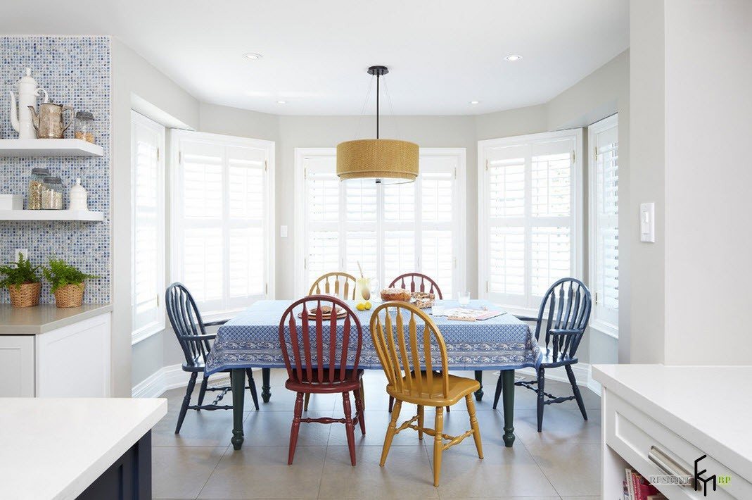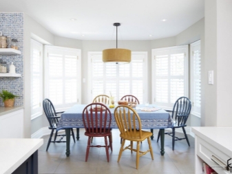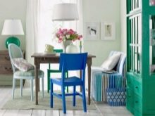 Originale Erscheinung haben farbige Holzstühle gefärbt. In vielen Stilen sehen solche Möbel sehr organisch und attraktiv aus, aber Sie sollten solche Modelle nicht in den gleichen hellen Ensembles haben, sonst wird das Bild des Raumes zu bunt.
