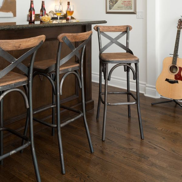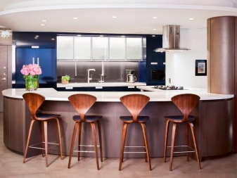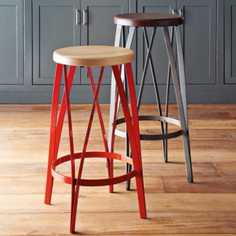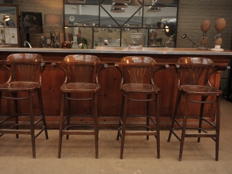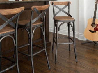 Sehr beliebt sind heute nicht nur klassische, sondern auch Barhocker. Solche Möbel haben ein anderes Design. In der Regel haben sie höhere Beine, die weit vom Boden entfernt sind, ergänzt durch ein schmales Querbalken-Fußbrett. Diese Produkte sehen sehr elegant und attraktiv aus.