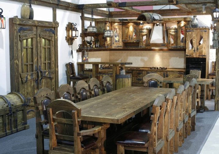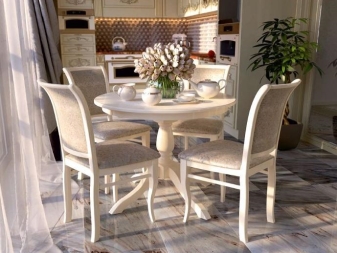 Holzstühle, stilisiert als antik, sehen nicht weniger reich und originell aus. Solche Möbel müssen durch geeignete Elemente im Innenraum unterstützt werden. Zum Beispiel kann es sich um dekorative Elemente im alten oder historischen Stil handeln.