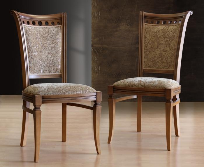 - Design. Der Stil und die Farbe der Holzstühle sollten der Stilrichtung des Innenraums entsprechen, in dem Sie sie platzieren möchten.Zum Beispiel können Sie in modernen Ensembles Modelle auf dem Metallrahmen kaufen, und in dekorativen Situationen werden Sie mit Schnitzereien und Vergoldungen verzierte Innenmodelle aussehen.