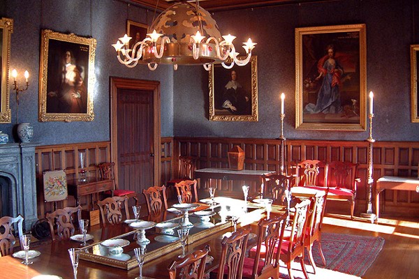 Designer-Vintage-Stühle sehen organisch in luxuriösen Interieurs aus Massivholz-Wanddekorationen, großen Holztischen, großen Gemälden mit teuren Rahmen und einem riesigen vergoldeten Kronleuchter mit Kerzen aus.