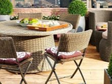 Rattan-Stühle können mit Kissen aus natürlichen Materialien ergänzt werden. Solch ein Ensemble wird eine raffinierte Dekoration des modernen Interieurs sein. Es kann verwendet werden, um das Interieur im Stil von Shebby-Chic oder Land zu verkörpern.