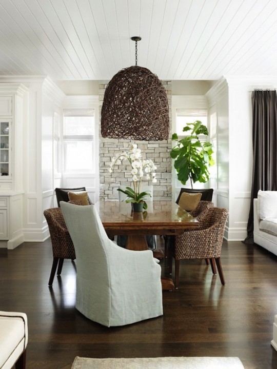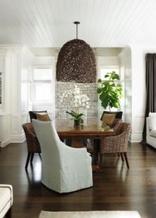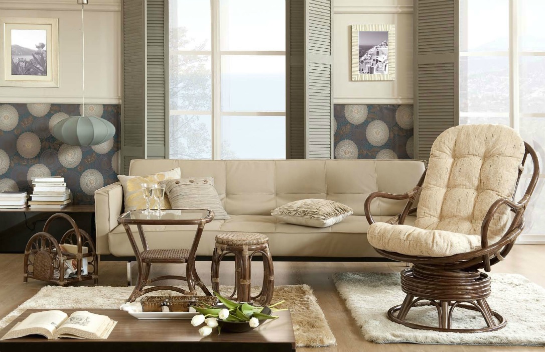 Klassischer Stil umfasst immer traditionelle Möbel, aber es kann mit Korbgeflechtelementen ergänzt werden, um dem Interieur Originalität zu verleihen. Im Wohnzimmer wird ein entsprechender Rattanstuhl sein. Kissen in leuchtenden Farben tragen zu mehr Komfort und Wärme bei. Für die Anordnung des Wohnzimmers können Sie ein Rattan-Headset oder nur einige Elemente dieses Materials verwenden. Jede Option sieht modisch, attraktiv und schön aus.