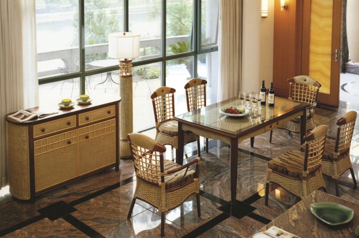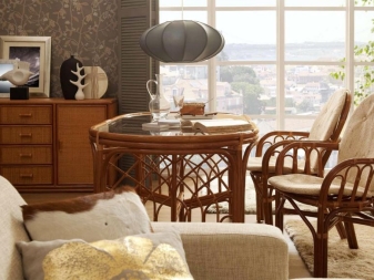 Rattan Stühle geben Charme, Luxus und Schönheit, wenn sie das Interieur in verschiedenen Stilen verkörpern. Die Kombination aus Rattan-Interieur mit Glas und stilvoller Dekoration sieht sehr schön und stilvoll aus. Stühle aus einer tropischen Liane sind perfekt mit Objekten aus einem Dekor aus künstlichen Materialien kombiniert.