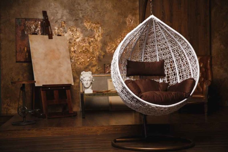 - Die Stühle auf dem Hängemechanismus sehen sowohl in der Wohnung als auch im Garten eines Landhauses wunderschön aus. Ein Merkmal des Modells ist, dass es sicher auf einem Stativ aus Metall befestigt ist. Ein solcher Stuhl hält einer Belastung von bis zu 250 Kilogramm stand. Dank der mobilen Stativbasis kann der Stuhl überall aufgestellt werden. Moderne Modelle werden durch eine Vielzahl von Formen repräsentiert.