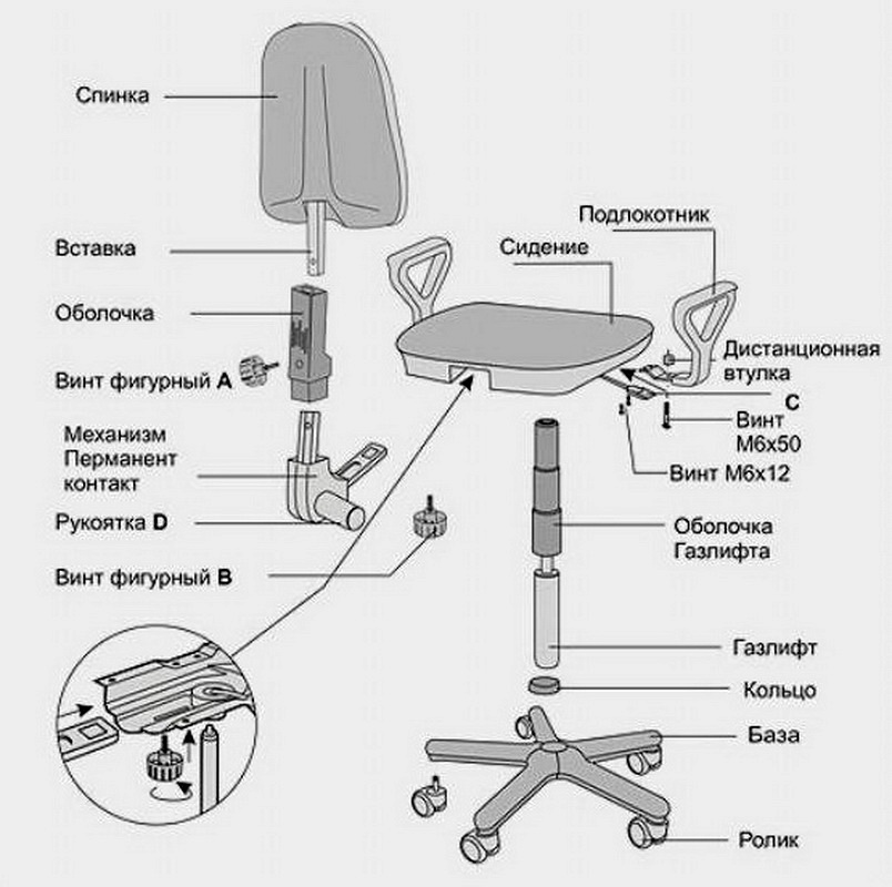 Die Montagephase des Stuhls ist wichtig, ebenso wie die Auswahlphase. Wenn der Stuhl mit komplexen Mechanismen ausgestattet ist, ist es besser, auf die Dienste professioneller Monteure zurückzugreifen. Wenn es mit einem ziemlich einfachen Gerät mit einem Gaslift ausgestattet ist, können Sie Geld sparen und Ihre Hand versuchen. In der Regel werden Anweisungen an ein beliebiges Produkt angehängt. Wenn es jedoch keine gibt, können Sie den folgenden Algorithmus für Aktionen verwenden.