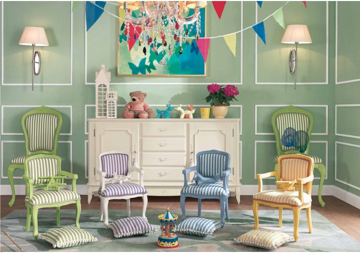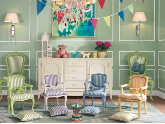 Hier, aber in einer separaten Gruppe, gibt es Kinderstühle mit Armlehnen.Die meisten Modelle haben Räder. Sie unterscheiden sich von der üblichen größeren Weichheit und helleren Farben.