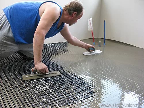 Aufgrund der Plastizität der Zusammensetzung kann als dünne (10 mm) und dickere (bis 200 mm) Schicht aufgetragen werden, was ebenfalls zur Erweiterung ihres Anwendungsbereichs beiträgt.Zum Beispiel erfordert das Verlegen eine dünne Schicht der Mischung, während eine dickere Schicht erforderlich sein kann, um den Boden zu füllen oder zu ebnen.