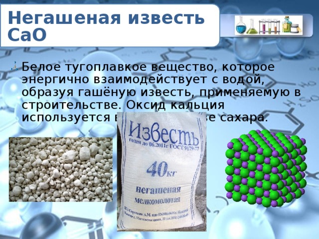 Die beim Rösten erhaltene Substanz hat einen weißen Farbton und eine kristalline Struktur mit einem kleinen Anteil an Verunreinigungen. Ihr Wert übersteigt in der Regel nicht 6-8% der Gesamtmasse. Die gebräuchliche chemische Formel von Branntkalk ist CaO oder Calciumoxid.