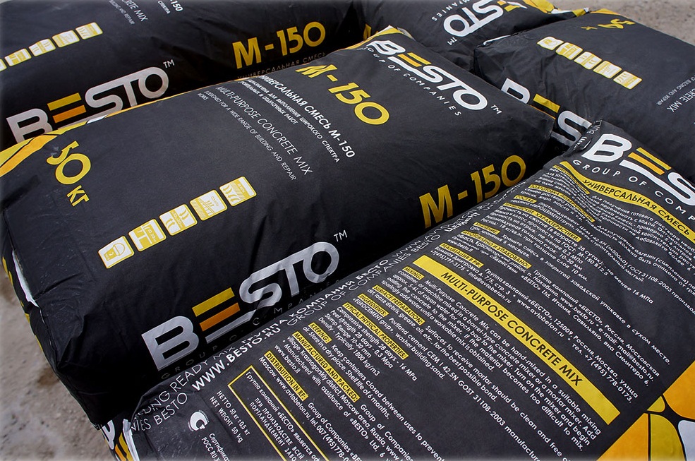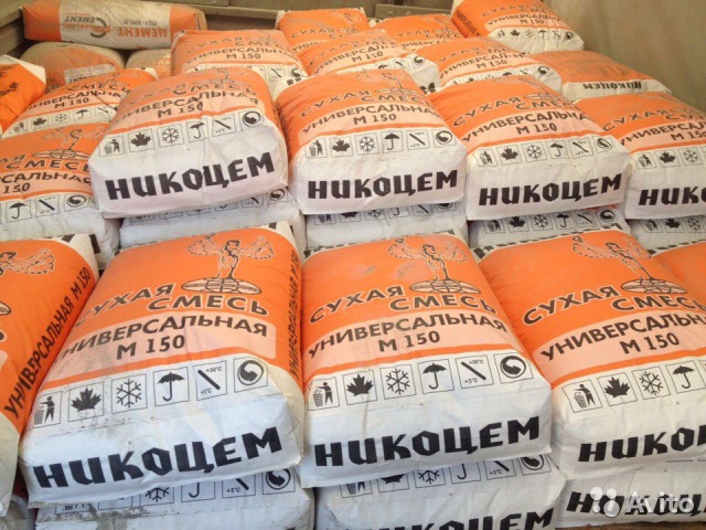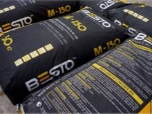 Produkte M150 - die beliebteste der Sorten von Universalmischungen. Es wird in nahezu allen Bauarbeiten mit Trockenformulierungen eingesetzt. Im Gegensatz zum M300 und M400 wird es zum Verlegen, Verputzen, Estrich verwendet. Fabrikverpackungen werden in Säcken von 50 kg angeboten, weniger oft produzieren Produkte von 25 kg pro Verpackung.