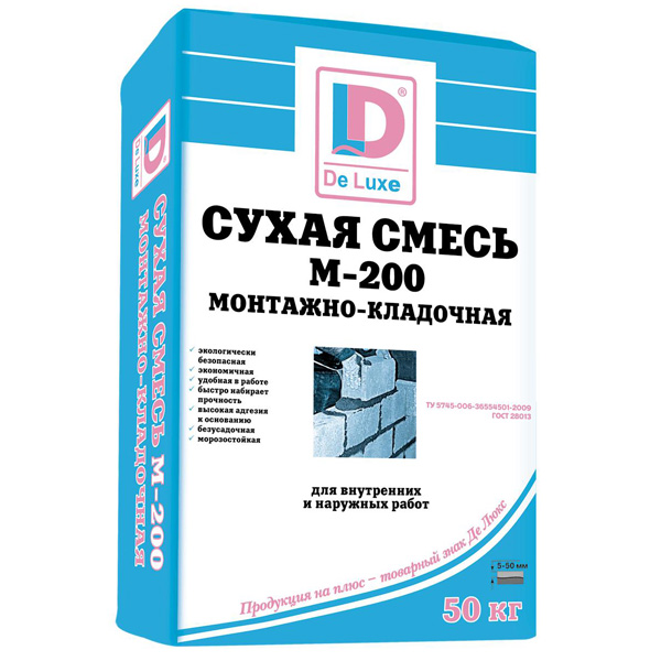 Produkte M200 ist eine Mauerwerks-Mischung. Es besteht aus Portlandzement, Flusssand und speziellen Zusätzen. Entwickelt für das Verlegen von Ziegeln, das Betonieren von Böden, das Bauen einfacher Fundamente, das Reparieren von Wänden und das Bearbeiten der Nähte von Betonkonstruktionen.
