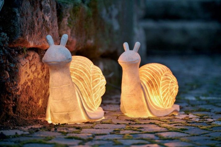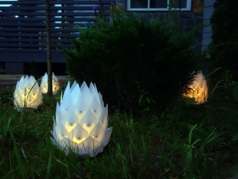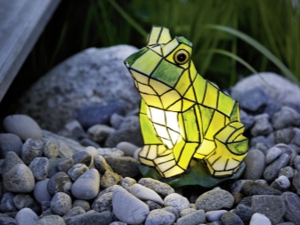 - Im Garten können Sie auch Lampen finden in Form von Tieren: "Frösche" mit leuchtendem Bauch, Schildkröten, Hasen, Igeln und Maulwürfen in Bergmannshelmen mit Taschenlampe. Mehrfarbige Brennelemente in Form von Steinen, in Form von quadratischen und runden Blumentöpfen und vielen anderen fantasievollen Formen für jeden Geschmack sehen spektakulär aus.