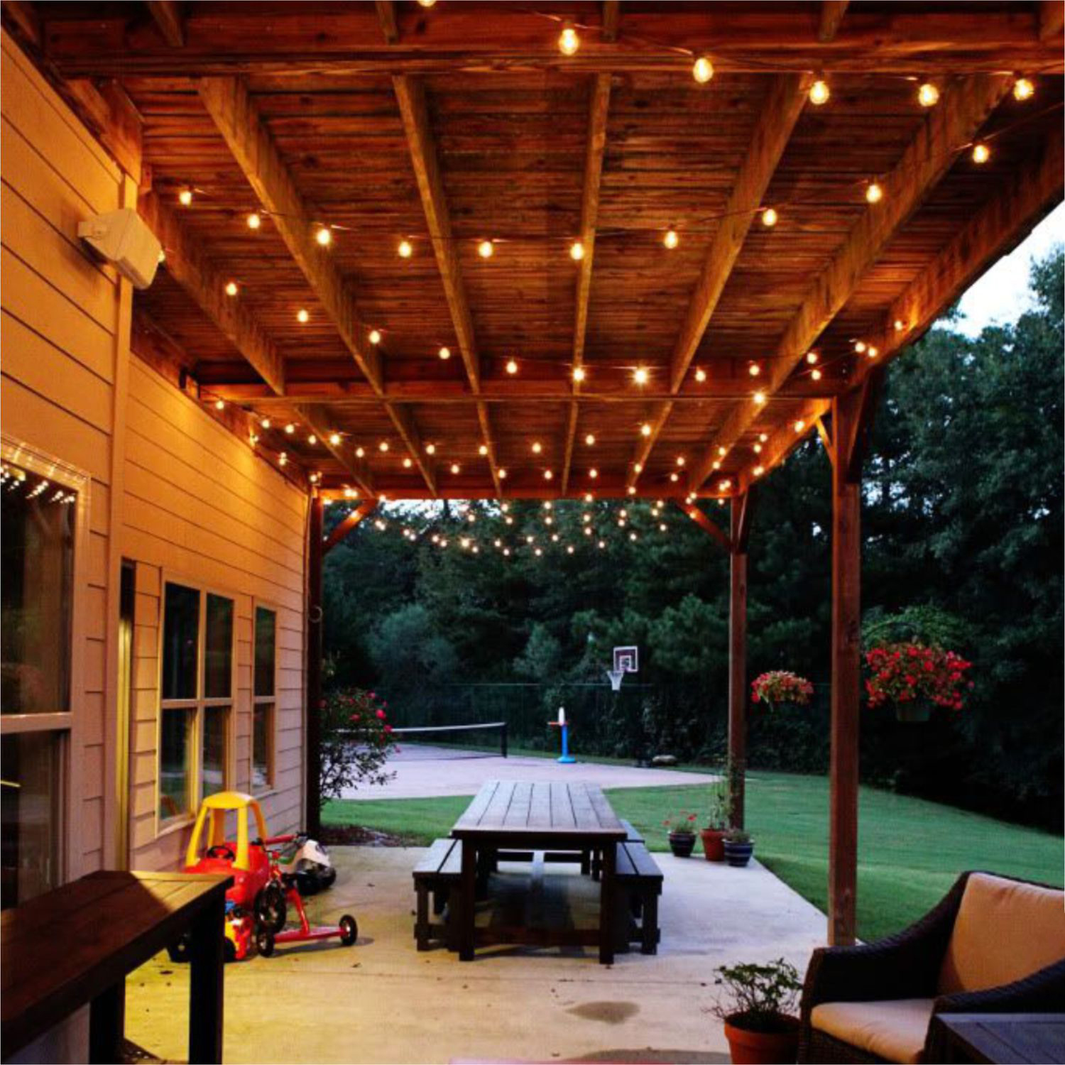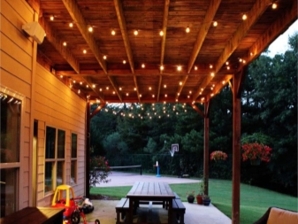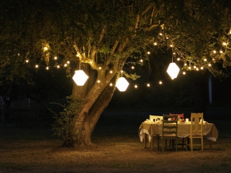- LED-Lampen in Form einer Girlande geben viel Licht, schaffen Gemütlichkeit auf der Straße und eine festliche Atmosphäre. Sie sind an einem Baum oder an der Basis des Gazebo aufgehängt.