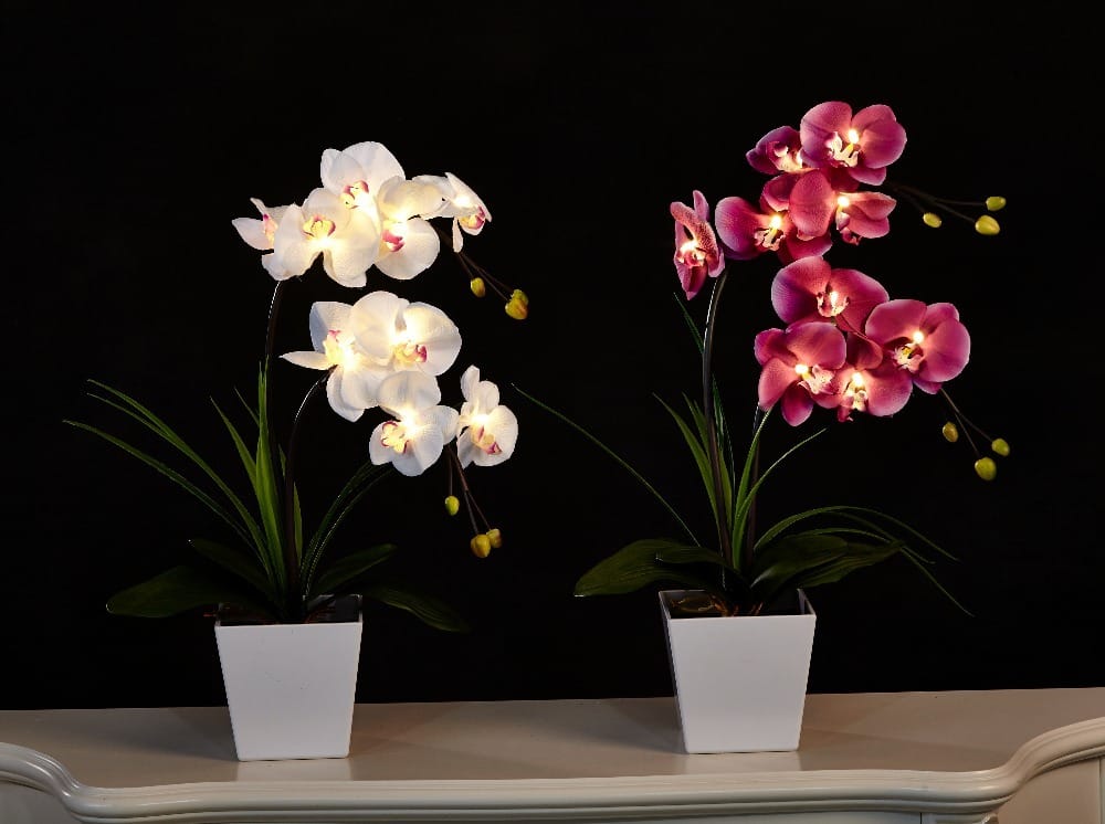 - Form "Orchidee" voll im Einklang mit seinem Namen. Künstliche Blumen, die sogar in einem Topf eine amüsante Eigenschaft haben - ein Stempel, der mit verschiedenen Farben brennt.