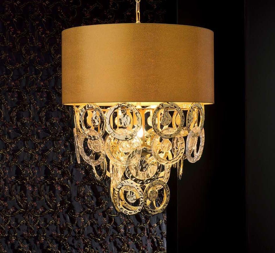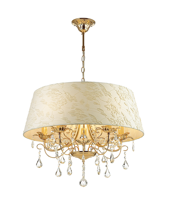 - Carob Kronleuchter mit Stoffschirmen mit Kristalltröpfchen verziert. Ein solches Gerät wäre sowohl im Barock als auch im Rokoko und im neoklassizistischen Stil angebracht.