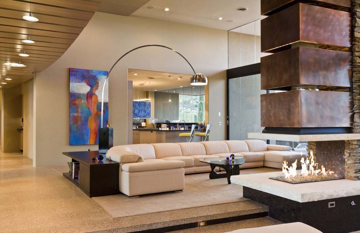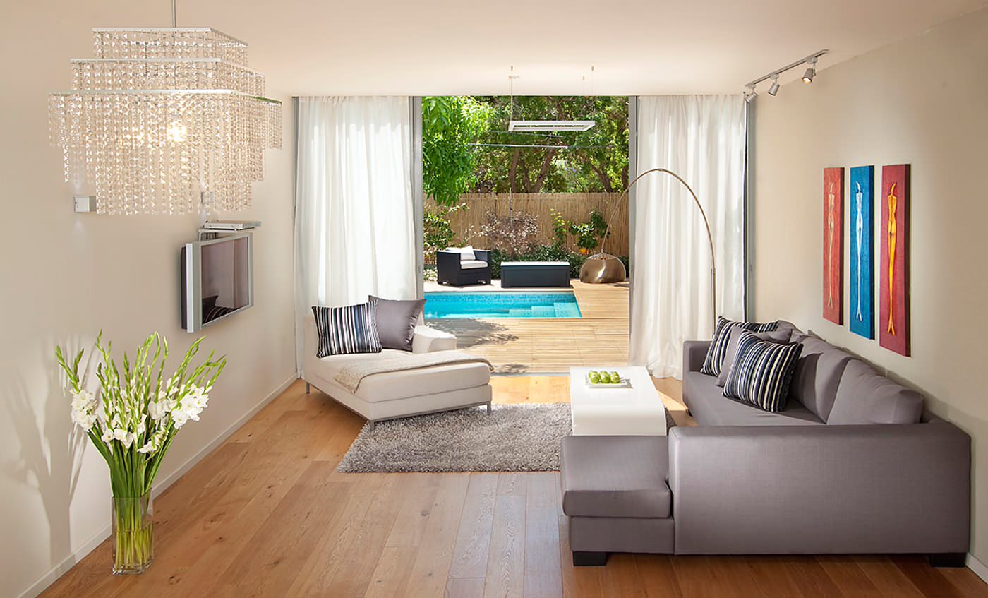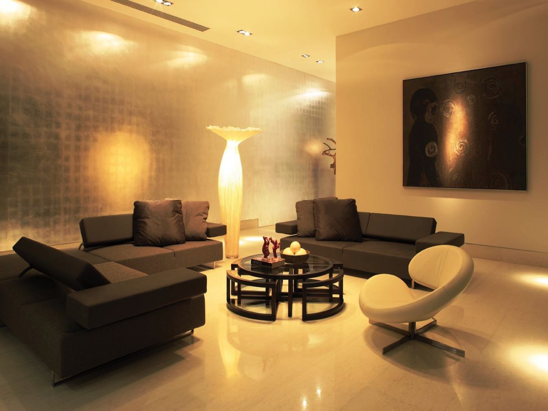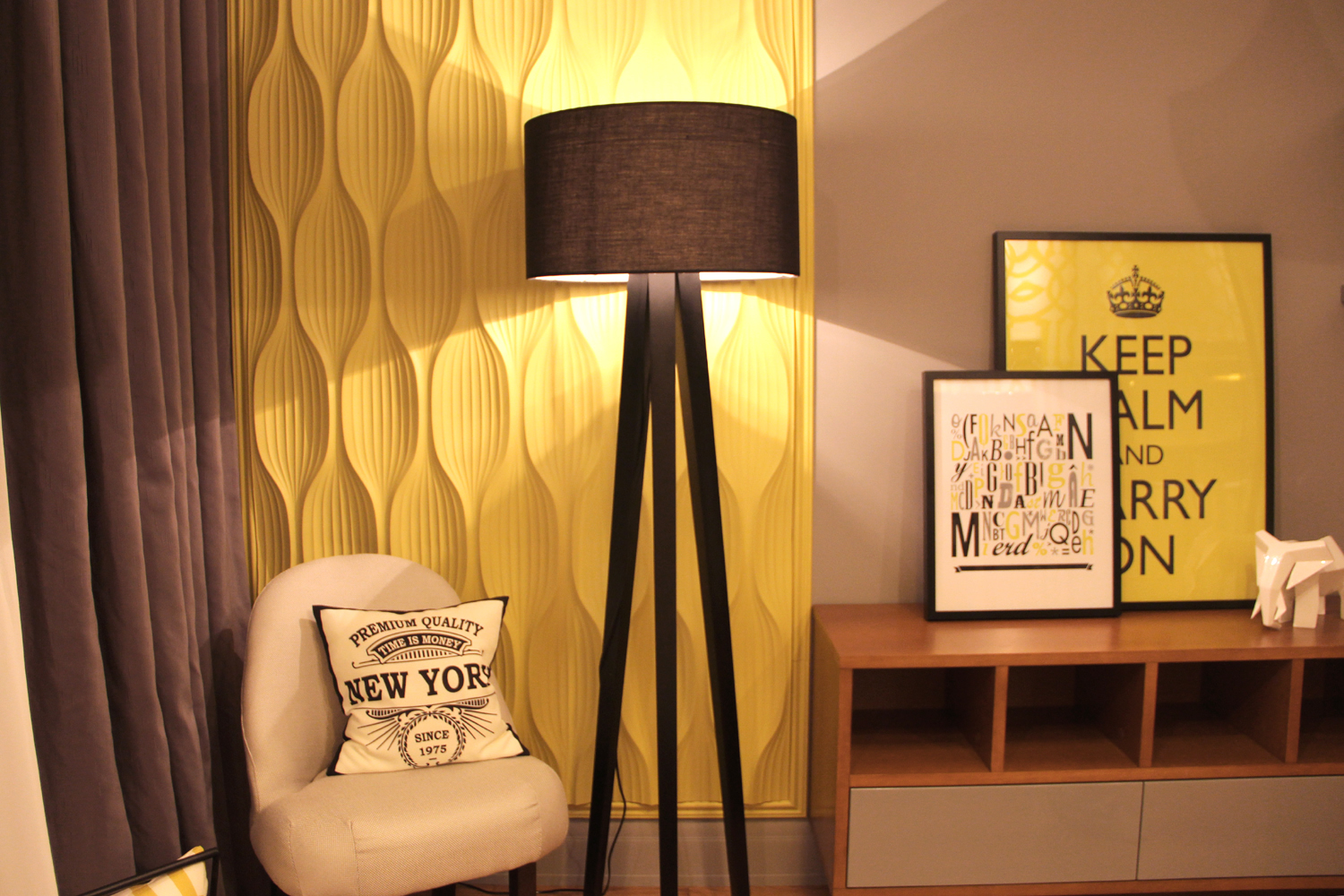 Ein Lichtstrahl, der auf die Wand oder die Decke gerichtet ist, beleuchtet den Raum vollständig und am besten mit einem oben offenen Lampenschirm auf einem biegsamen Stativ. Diese Option ist ideal für ein geräumiges Wohnzimmer.