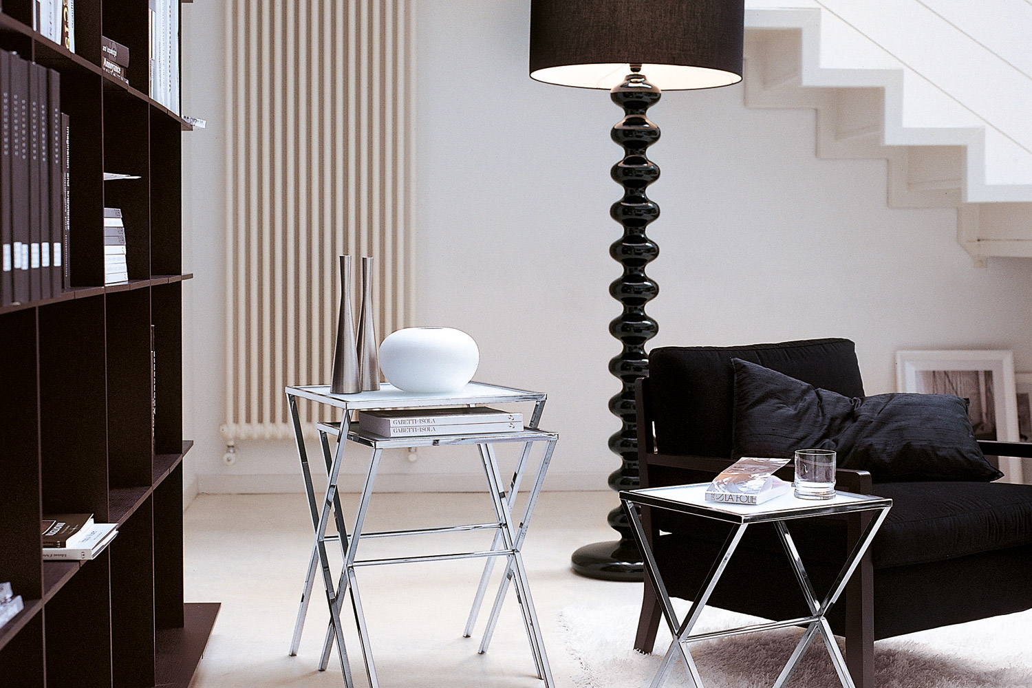 Das Design wird von einer Lichtquelle gekrönt, die auf dem Stativ montiert ist. Es kann mit einem Lampenschirm drapiert werden oder offen Lampe bleiben, je nach Produkt-Design und Interieur-Stil.