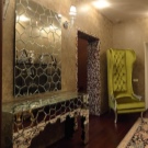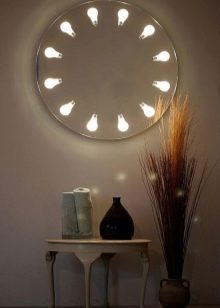 Lokale Beleuchtung - zum Beispiel für einen Spiegel, können Sie eingebaute Lampen oder hängen Sie zwei originale Wandlampen auf beiden Seiten. Der Kleiderschrank wird direkt im Gehäuse oder an den Wänden beleuchtet - kleine LED-Lampen können dort montiert werden.