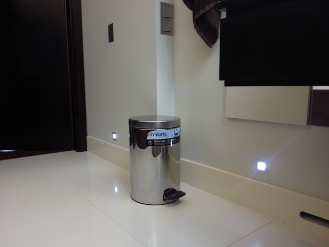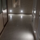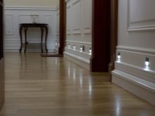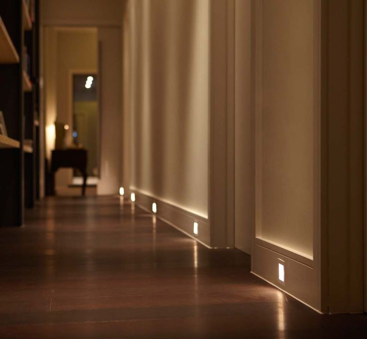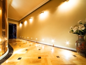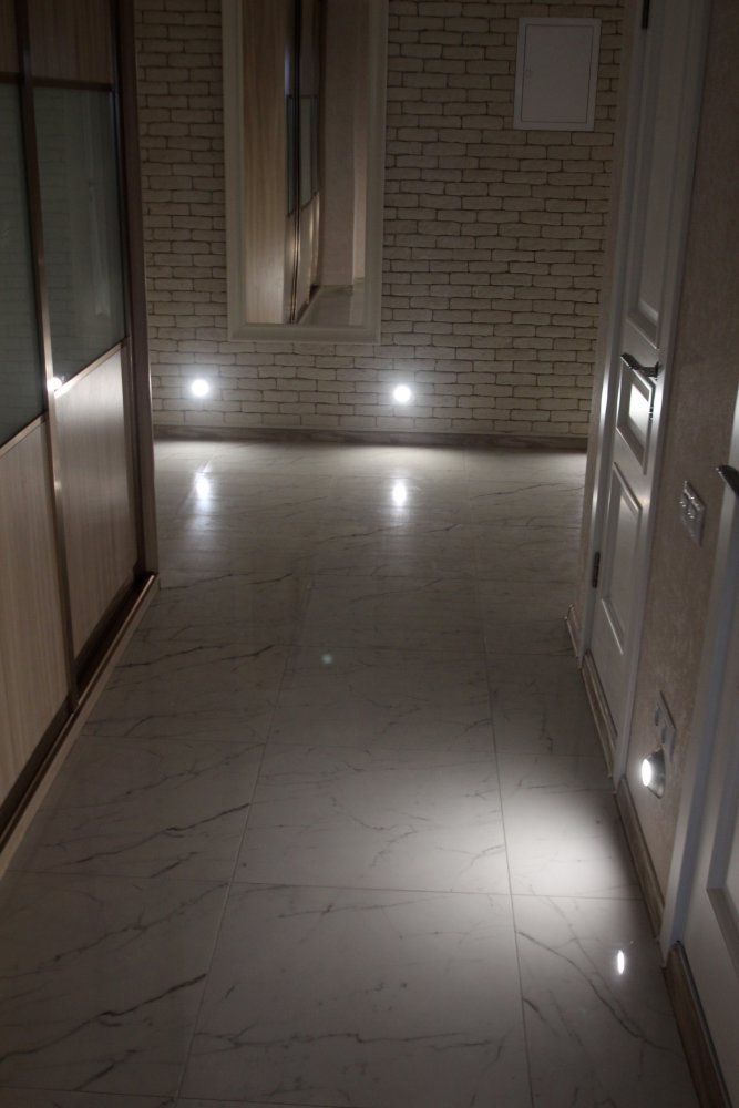 Wenn der Boden im Flur dekorative Unregelmäßigkeiten aufweist (z. B. ein Podest) oder Sie eine Leiter in Ihrer Wohnung / Ihrem Haus haben, sollten Sie unbedingt die Bodenbeleuchtung in Betracht ziehen. Es wird nicht nur schön aussehen, sondern auch vor Verletzungen schützen.