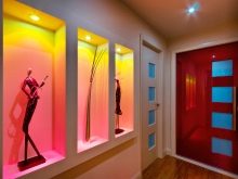 Es gibt eine besondere Art von Beleuchtung - dekorativ. Dies sind zusätzliche "Boni" im Flur, wenn es groß ist. Dekorative Beleuchtung ist notwendig, um einige spezielle Teile des Interieurs hervorzuheben. Zum Beispiel in der Wand gibt es eine Nische, in der es eine schöne teure Vase gibt.Über der Nische oder seitlich davon können Sie kleine eingebaute Lampen platzieren, dann wird die Vase wie in einem Museum aussehen.