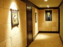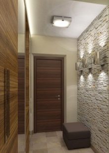 Wenn im Flur strukturierte Wände - mit Backstein, Stein, Holzvertäfelung, können Sie sie auf eine besondere Art und Weise beleuchten. Spot (eingebaut) Licht oder geometrische Lampen der richtigen Form mit hellen Lampen werden den gewünschten Effekt erzielen.