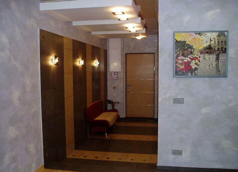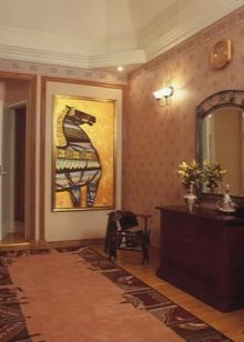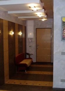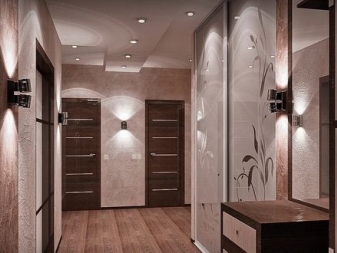 Wenn der Flur klein ist, ist es besser, bei einer bescheidenen Decke anzuhalten, die das Licht an die Decke streut.Wenn sich neben dem Teppich für die Beine und der Haushälterin (Spiegel, Schrank) noch etwas im Flur befindet, müssen sie hervorgehoben werden.