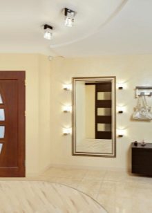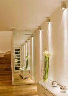 Um ein wirklich komfortables und modernes Interieur zu schaffen, ist es sinnvoll, einen kleinen Korridorraum einzuteilen, und das am besten mit Hilfe von Beleuchtung. Insbesondere, um den Bereich an der Tür, Spiegel oder Schrank mit Oberbekleidung deutlicher hervorzuheben. All dies negiert nicht eine gemeinsame Lichtquelle - zum Beispiel eine Decke über der Eingangstür oder in der Mitte der Decke.