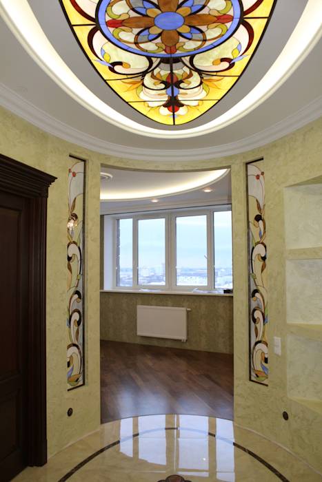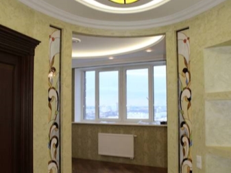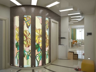 Das beleuchtete Buntglasfenster wirkt sehr originell und teuer - an der Wand oder Decke ist eine dekorative Glasscheibe angebracht, hinter der sich eine helle Beleuchtung befindet. Es gibt eine Illusion, dass dies ein Fenster ist, durch das Sonnenlicht eindringt.