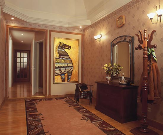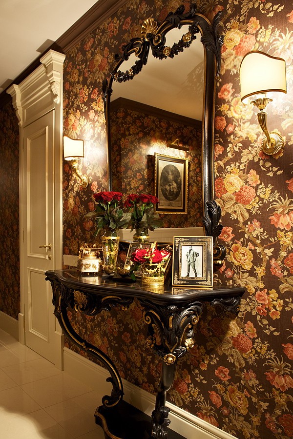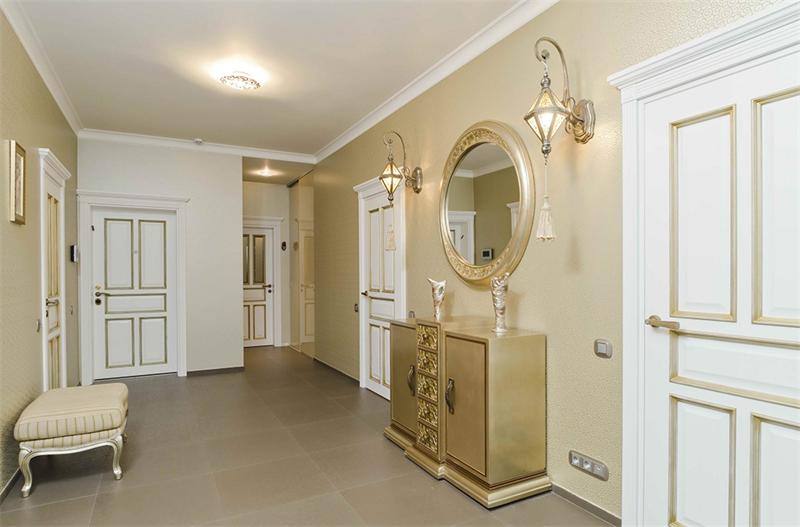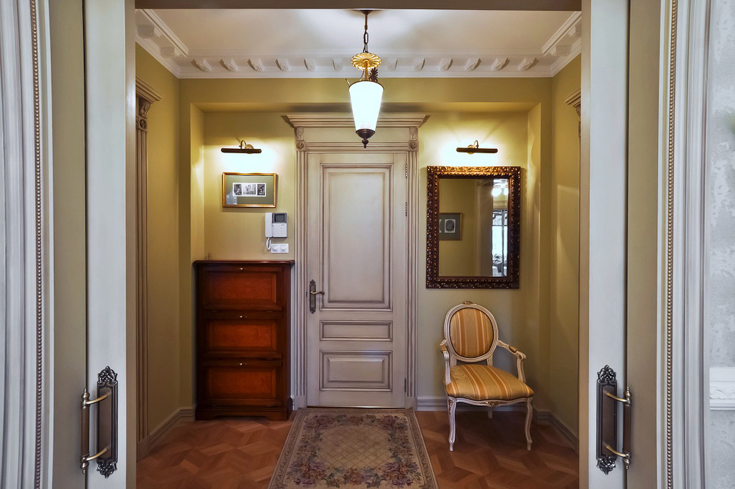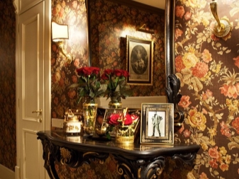 Für das Interieur in einem klassischen Stil, perfekte Sets von Kronleuchter + Wandlampen. Je nach "Luxus" -Design des Raums können Sie mehr oder weniger komplizierte Modelle wählen. Achten Sie auf die Klassiker - Plafonds in Form von Blumen, Kugeln, "Kandelaber" mit Kerzen. Für einen bescheidenen Flur können Sie die Decke aus einfachen geometrischen Formen wählen - halbkreisförmig, rund, quadratisch. Substrate können Metall oder Holz sein.