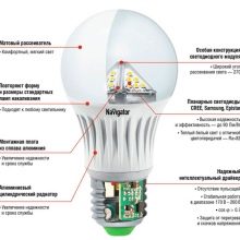 Die Lampe basiert auf einer Metallbasis, einem Körper aus nicht schmelzenden Metallen, einer Power-Platine und einer Scheibe mit LEDs sowie einer transparenten Glaskuppel. Während der Verschmelzung der beiden Materialien, von denen jede LED-Glühbirne aus einem besteht (einer von ihnen ist mit positiven und der andere negativ geladen), werden zwei Substanzen in dem LED-Gehäuse gemischt und Wärme wird erzeugt.