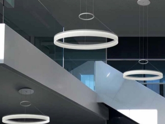 - Ring. Die runde Lampe ist eine leichte Scheibe, die an der Oberfläche oder an Kabeln befestigt ist.