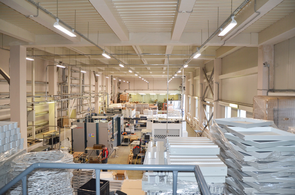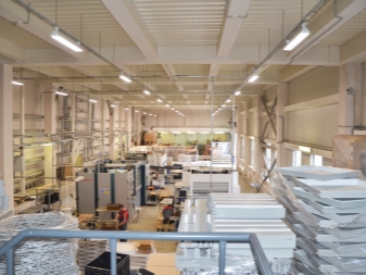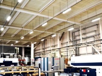 Große Räume von Fabriken, Fabriken und Lagerhallen sind bequem mit aufgehängten großen Beleuchtungskörpern beleuchtet, die helles, gleichmäßiges Licht erzeugen. Es flackert nicht und ist für das menschliche Auge sicher.
