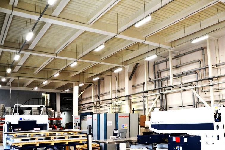 - Industriell. Meist an Kabeln an der Decke montiert. Verwendet in Fabriken, Werkstätten, Lagerhäusern, etc.