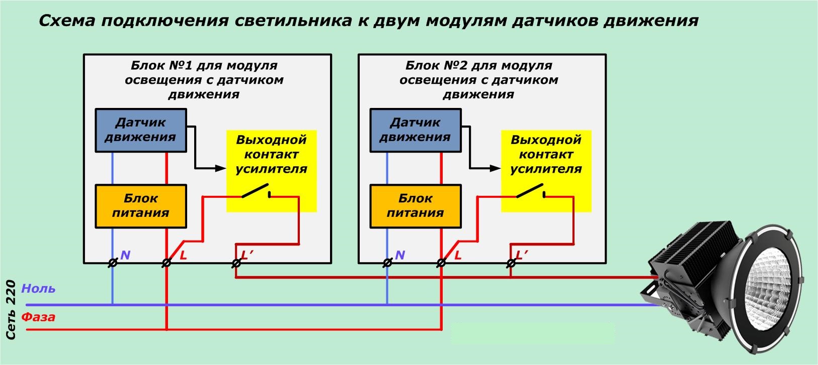 Manchmal müssen mehrere Sensoren in einem Stromkreis zusammengeschaltet werden. Dies ist der Fall, wenn die gekauften Sensoren ein kleines Arbeitsspektrum haben, so dass die erforderliche Fläche nicht abgedeckt wird.Dann müssen alle Bewegungssensoren in der gleichen Phase angeschlossen werden und sie sollten parallel geschaltet werden.