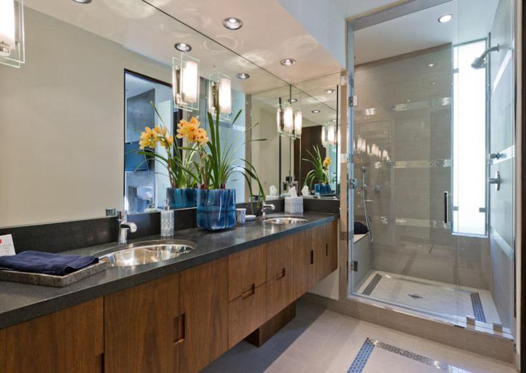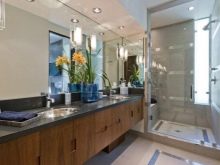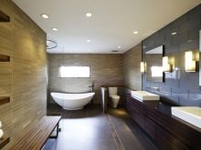 - Was das Badezimmer betrifft, so ist es vorzuziehen, die Lampen um den Umfang herum anzuordnen und sie etwas in der Mitte zu installieren oder sie in einem Halbkreis von gegenüberliegenden Ecken anzubringen.