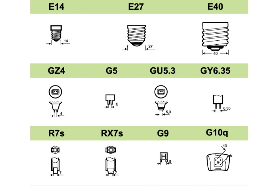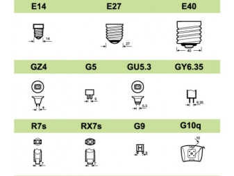 Jede Lampe hat, unabhängig von Design und Form, eine Patrone - hier wird die Glühbirne eingeschraubt oder befestigt. Dementsprechend gibt es für jede Patrone eine bestimmte Art von Basis. Zur Bequemlichkeit der Bezeichnung haben die Menschen die alphanumerische Bezeichnung des Basistyps erfunden. Der erste lateinische Großbuchstabe gibt seinen Typ an, der zweite sein Subtyp und der dritte Kleinbuchstabe die Anzahl der Kontakte.